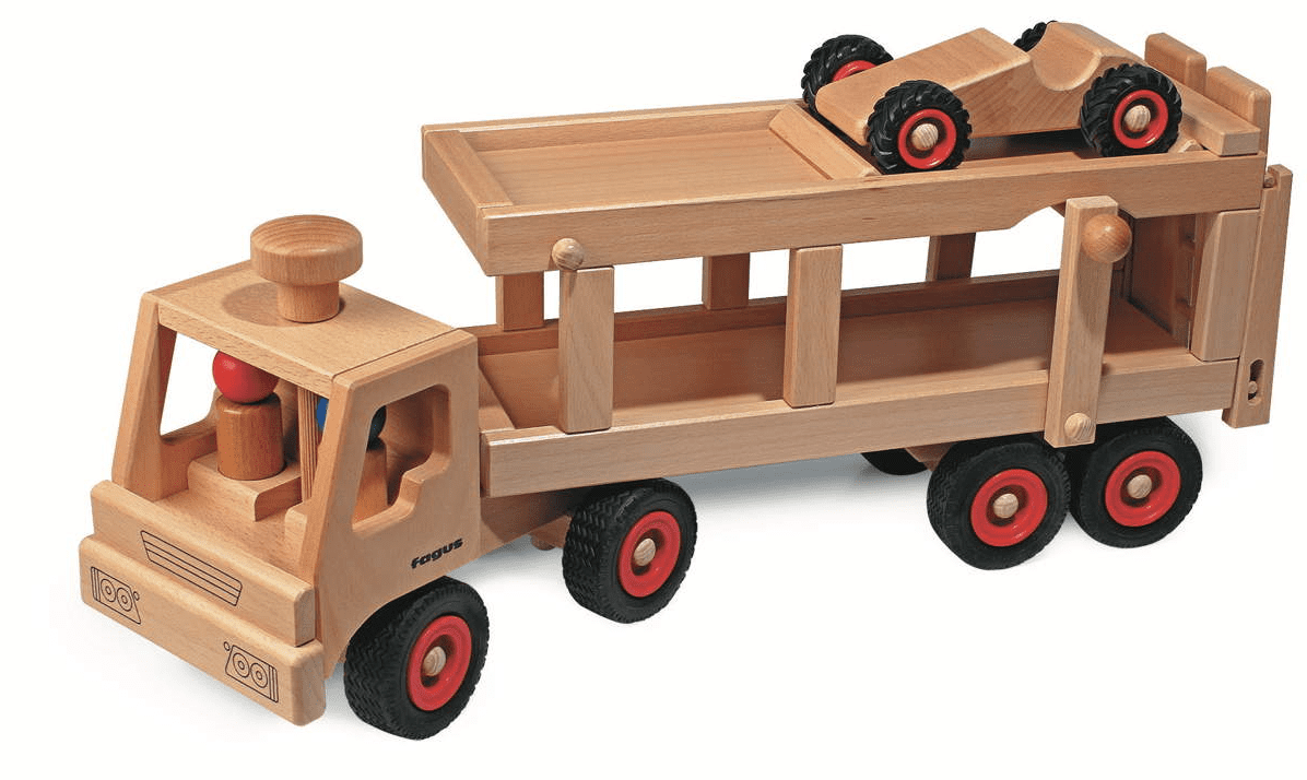 von fagus begeistert immer wieder mit einer technischen Raffinesse: Das Oberdeck wird durch einen Handgriff abgesenkt und nachdem die hintere Ladeklappe umgelegt wurde, können die neuen Autos zum Händler transportiert werden. Das Fahrzeug ist lenkbar. Zwei Fahrer (rot und blau) sowie ein Knubbel-Auto (Speedy) sind im Lieferumfang enthalten.